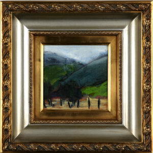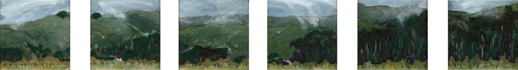 The six paintings in this series, while still representational, are a little more gestural than the first and introduce charcoal lines worked into the oil paint. The six works can read together as one panorama across a single landscape