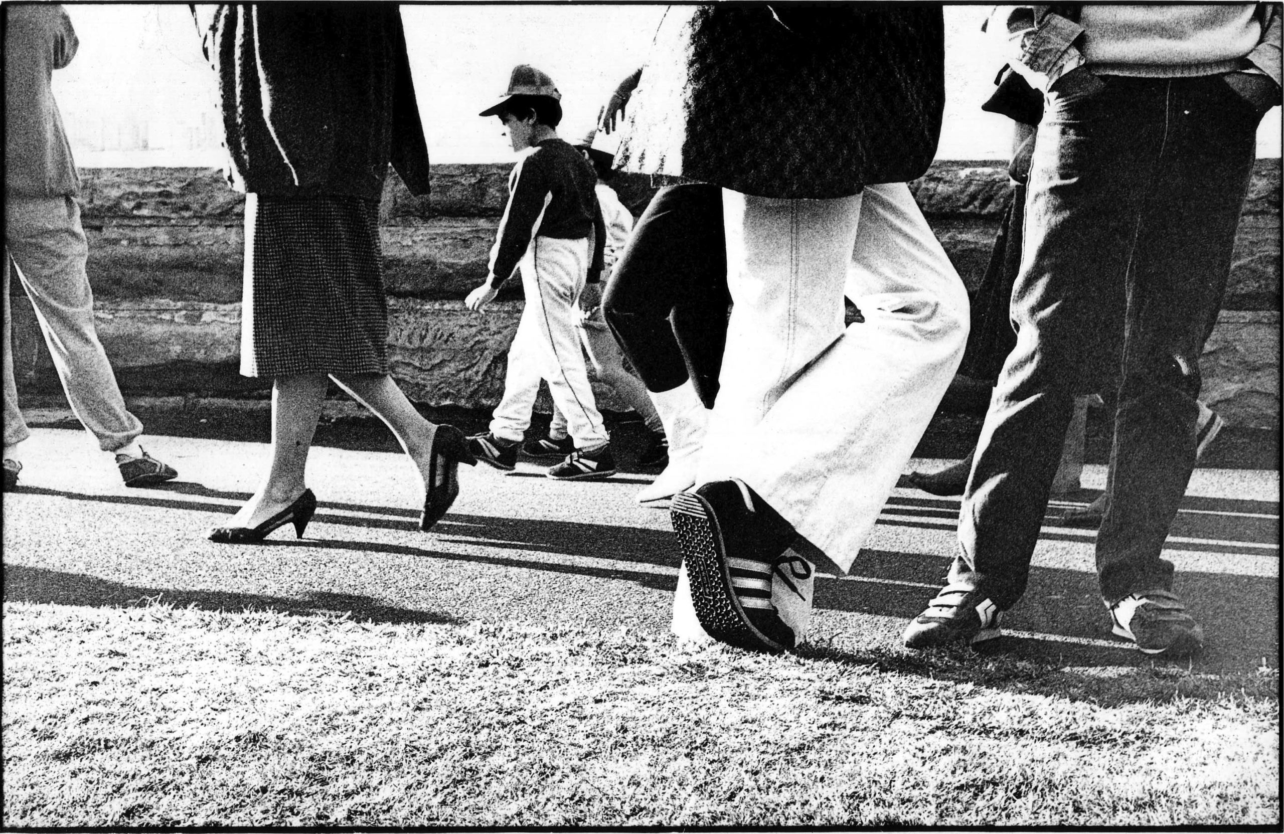 A quick photographic snap of people walking by at the Sydney waterfront in 1986.